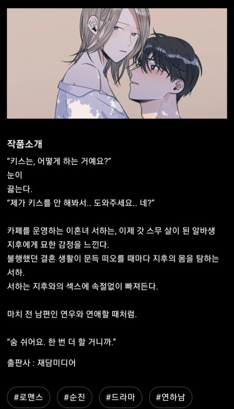 사람은 첫인상이라고 하지만 만화가 아니다. 하지점을 한마디로 표현하면 어른을 위한 19금이라고 말하고 싶다. 우선 일본 만화 특유의 보호본능을 자극하는 히로인, 울보의 귀여운 얼굴이 없다. 남성용의 19금처럼 물풍선으로 축 늘어진 가슴 없음. 마지막 결정수는, 작품소개에 '뽀뽀는 어떻게 해요?' (너무 오는 건 포인트인 것 같아서, 오늘 작품소개 스샷을 찍어본다)